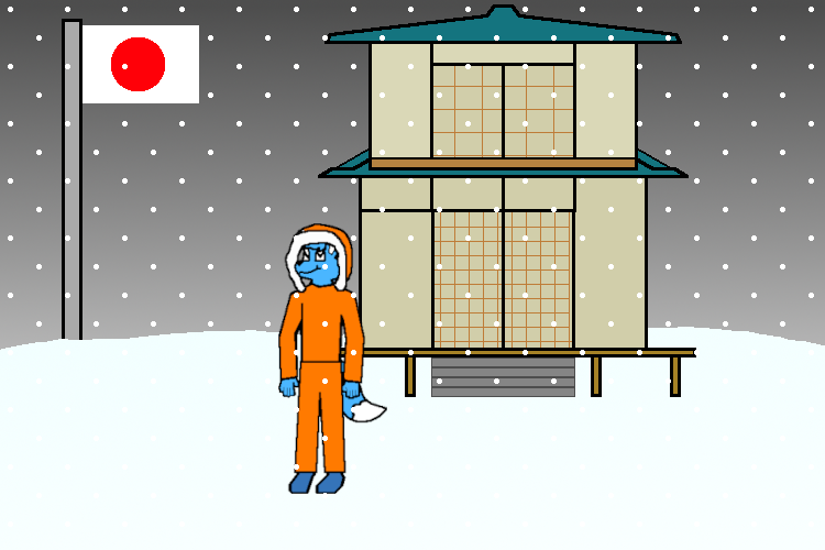 Terry the Blue Fox (53 years old) is in Hokkaido, Japan on a cold Winter's day, when it's snowing there.