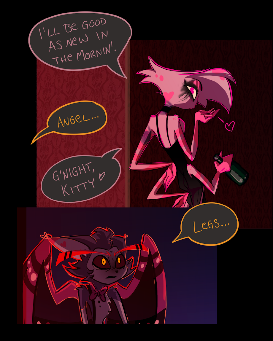 This is a scenario that's been playing on my mind - Husk seeing Angel after a rough shoot, and realising the extent of the abuse he is going through. THEY BETTER HAVE A HAPPY MOMENT IN S3 FHAJJFJSNFMW