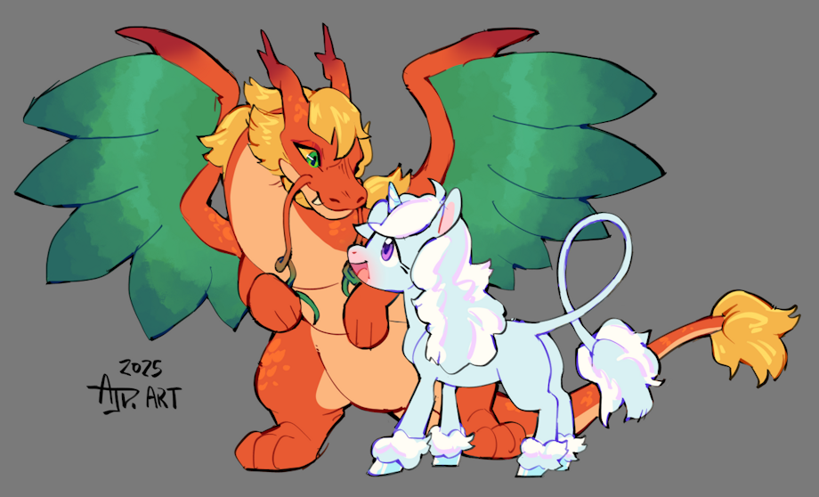 My fancy eastern style charizard Hiro hanging out with my lil galarian ponyta Pandora!