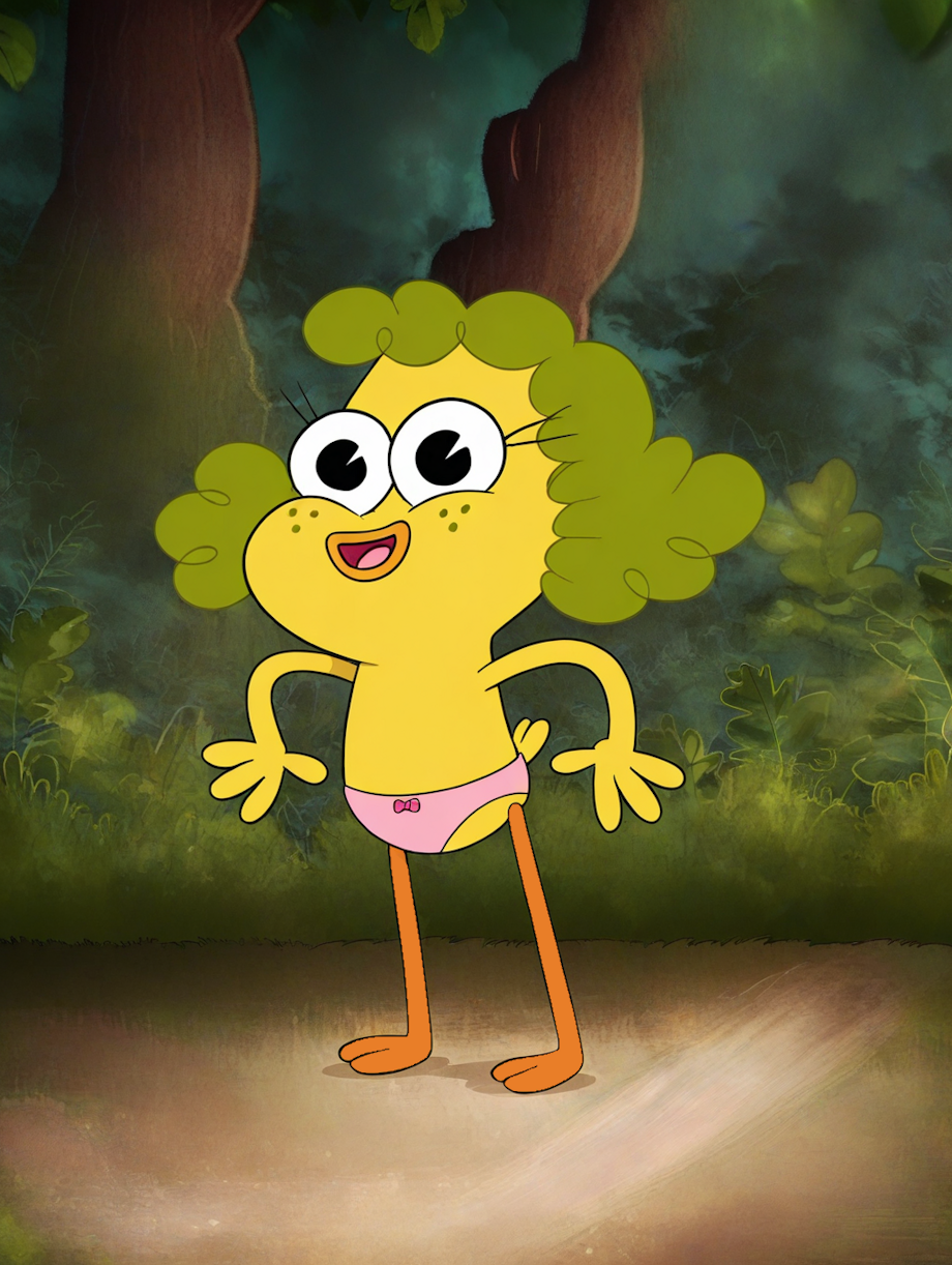 Pic1 Prompt: Beautiful("Score_9") (solo:1.4) A cheerful yellow cartoon child character with a yellow face with freckles on cheeks and curly ligth green hair standing in a , forested area. Shes wearing nothing but pink panties, The character wears nothing, and feet, Their large, expressive eyes with pacman pupils, and a bright smile convey excitement and greenery in the background. Keywords pink panties, flat chest, ( four fingers on each side) ,
