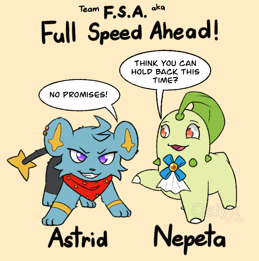 Behold, my PMD Explorers team! The former human who loves being a fierce lightning cat, Astrid the Shinx! And her calmer best friend and partner, Nepeta the Chikorita!