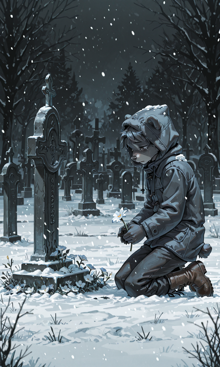 13-year-old Anthro very young male bear cub standing in front of a gravestone alone kneeling placing flowers in a snow-covered cemetery alone head titled down tears in his eyes wearing a winter coat, pants, and boots, side view hood up