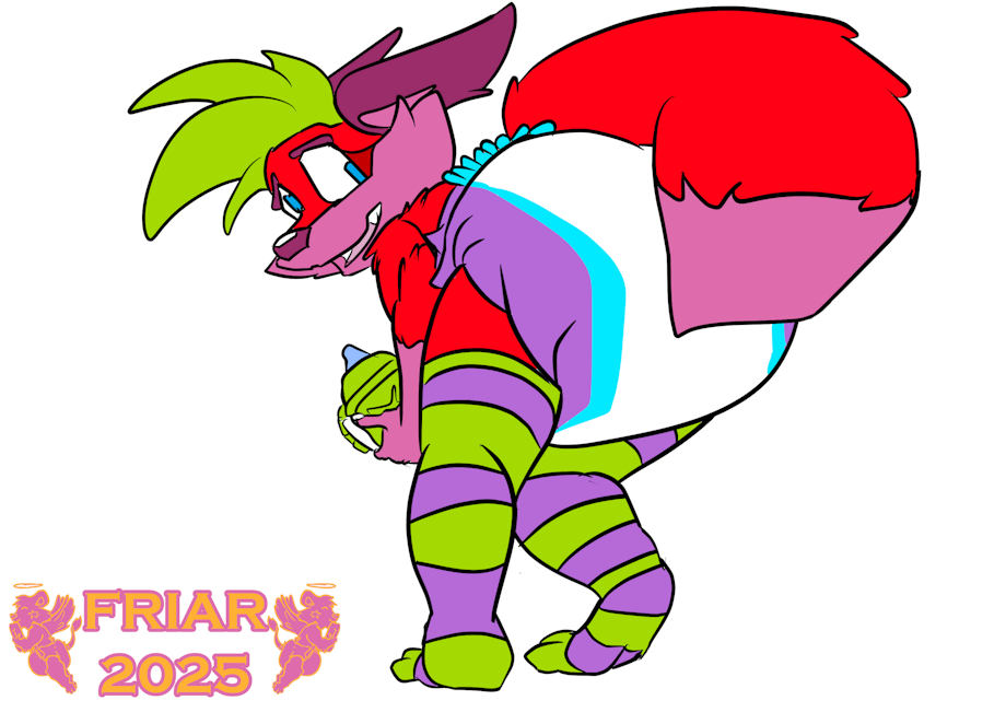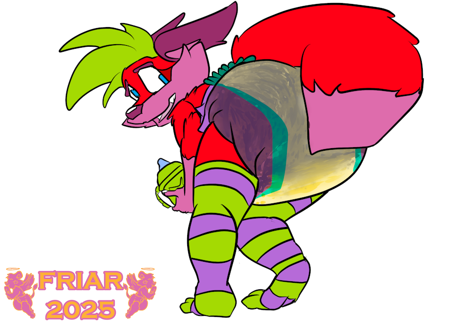 Illustration of Berry the wet and messy diapered fox bending over and filling his diaper while showing off his thigh high socks. "Oops! Didn't mean to make big poopies there. Do you like my new socks?"