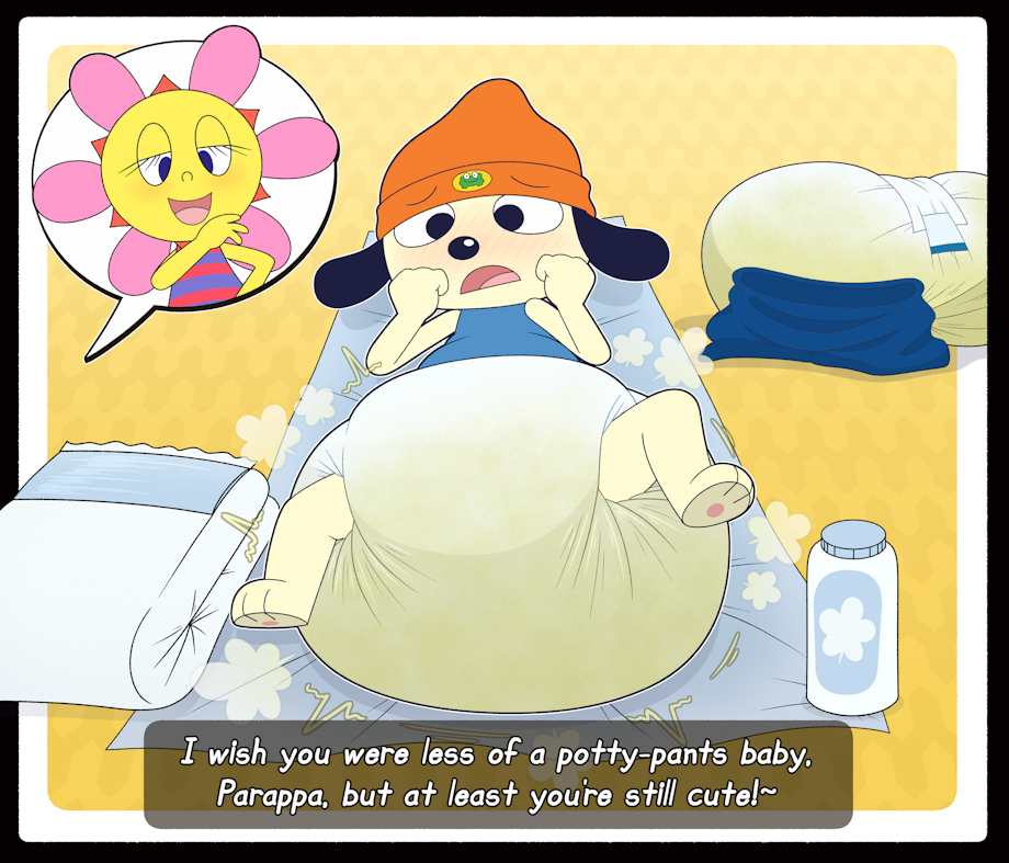 I f you were going to make a Parappa diaper Pic, why not base it off of that bathroom level from the 1st game? Maybe Parappa should've messed himself in this Pic and Sunny should say "I wish you were more of a man and less of a potty-pants baby, but you're still cute."