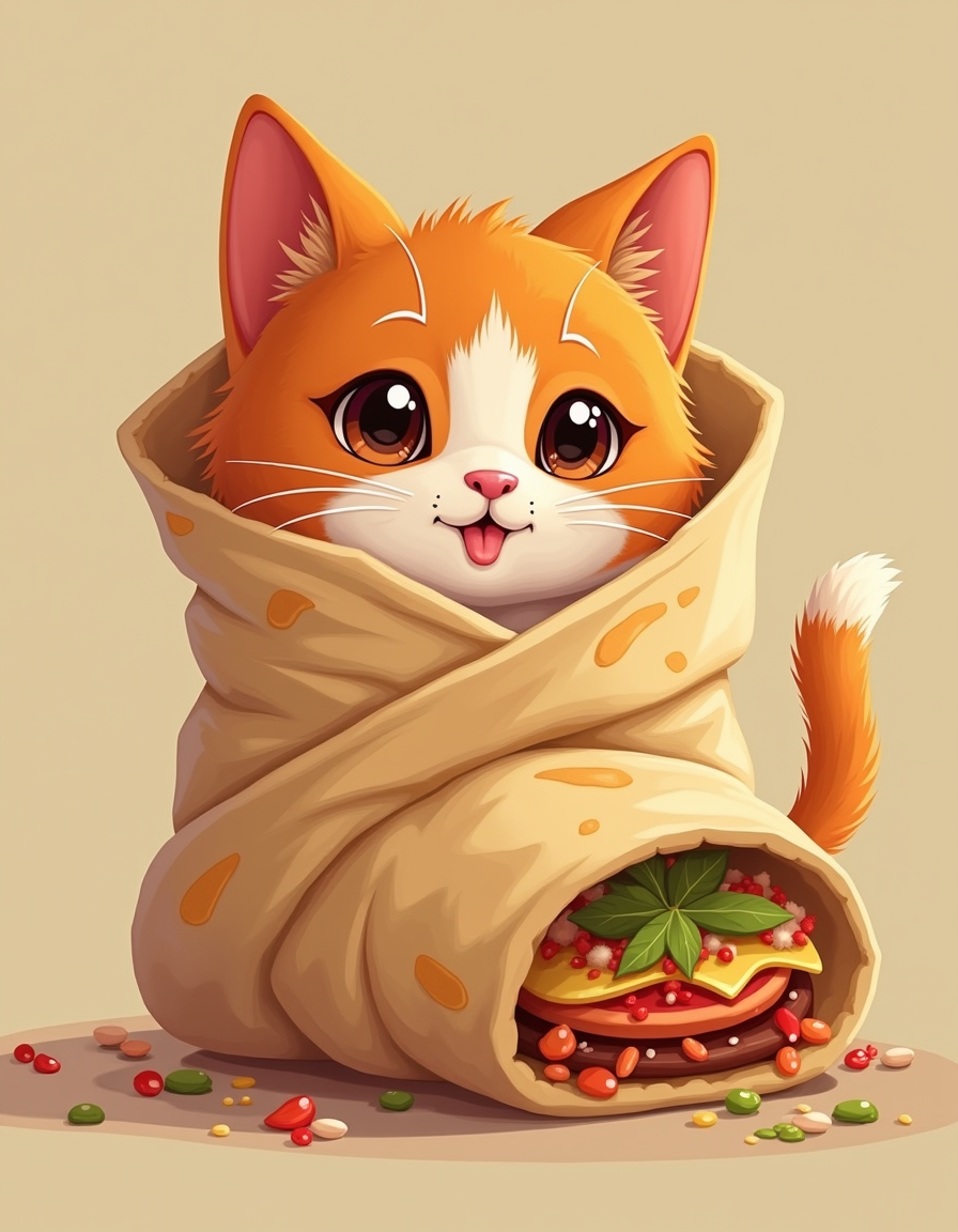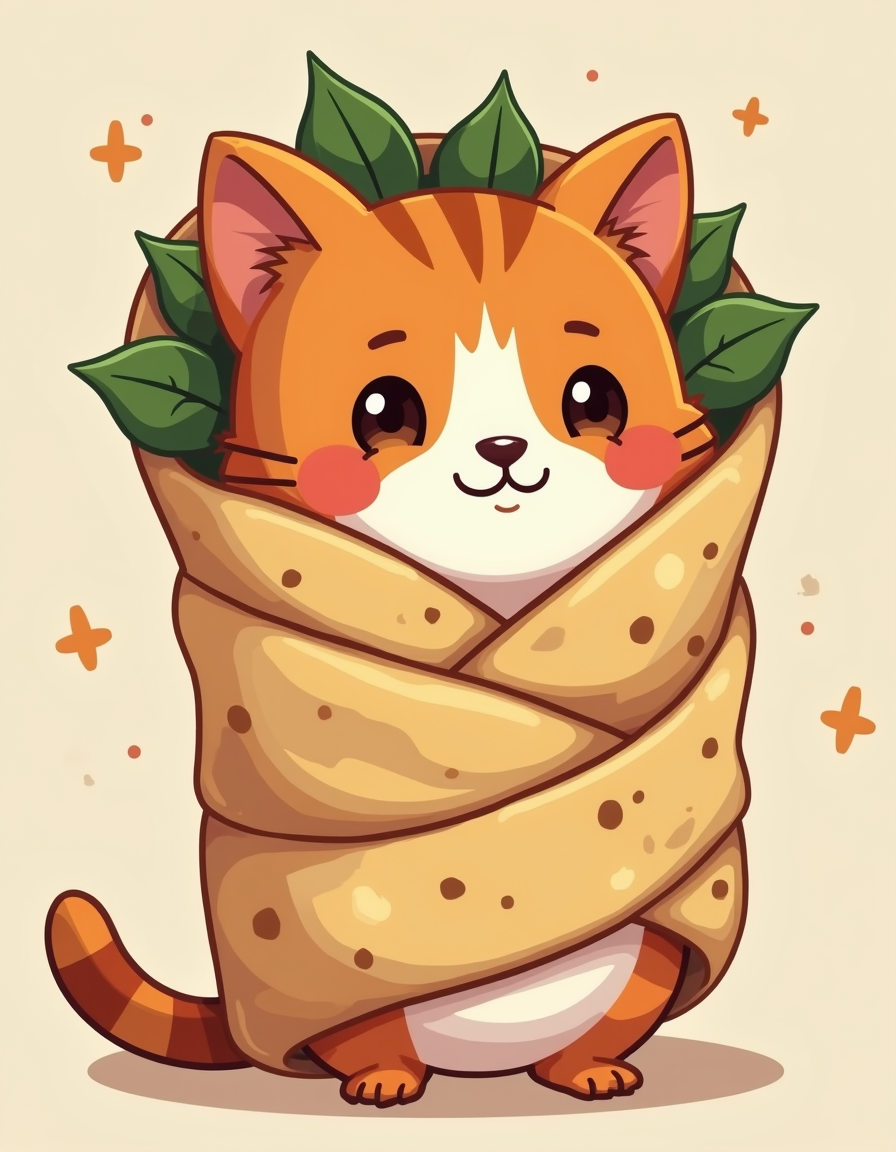 Parameters: cute cartoon cat wrapped in mexican burrito