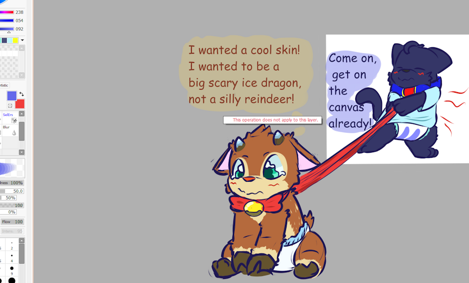 The silly dragon reindeer doesn't want to go onto the canvas.