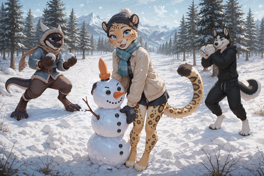 Amy the leopard and Wilk the husky decided to pay a visit to their friend Klein the kobold in the snow-covered forest. Klein had never really liked winter—the cold crept into his scales, stiffened his fingers, and made every step feel heavier than it should. Still, he welcomed them. Good company, after all, had a way of making even the cold more bearable.