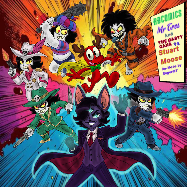 Cue a sweeping mass media montage. The Nasty Gang load up their signature weapons—bats, blades, guns, glittering explosives—while Tres watches from a balcony, coat fluttering as his telepathy weaves the perfect smear campaign through the city’s gossip and TV feeds. Down on the streets, Stuart Moose and the Stupid Team cheerfully patrol, completely oblivious that wanted posters are popping up with their own faces on them, labelled “Corrupt Toony Menace—Capture On Sight.” Neon signs flicker over alleys, Latin beats thump from passing cars, and the skyline of Crank Central glows like a pinball machine about to tilt. Between one overpowered moose and his pals, five murderous cartoon mafiosas, and one smug telepathic bat-kingpin pulling the strings, the south district is primed for a loud, colorful, absolutely ridiculous showdown—and the only guarantee is that nothing about it will be subtle.