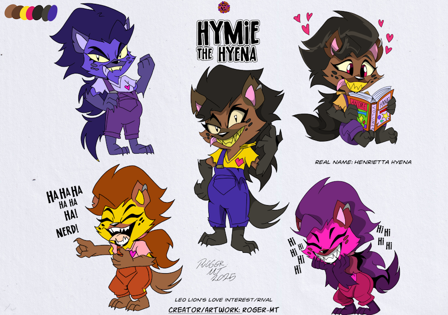 ----- Hymie the Hyena (real name: Henrietta — but call her that at your own risk) is Leo Lion’s fiercest headache and his most confusing crush. Tough, ruthless, and proudly tomboyish, she rules the schoolyard through claws, teeth, and sheer chaotic energy. Hymie wrestles, bites, scratches, and laughs her way through every conflict, treating school like her personal savannah. She’s a mischievous bully with a brain full of wild schemes, starting fights for fun, territorial bragging rights, or simply because she’s bored. Underneath that attitude though? She’s a walking storm of contradictions — loud but shy, aggressive but affectionate, cruel but strangely protective.