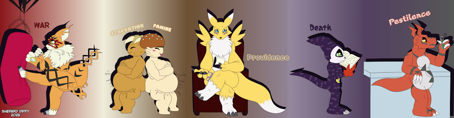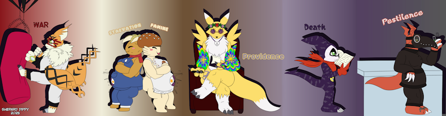 Meet the Digimen of the Apocalypse, with War the Meicoomon (martial arts/fitness instructor), Starvation the Potamon & Famine the Burgermon (Belly Busters founders), Providence the Renamon (life coach), Death the Impmon (history archivist) and Pestilence the Guilmon (pharmaceutical researcher).