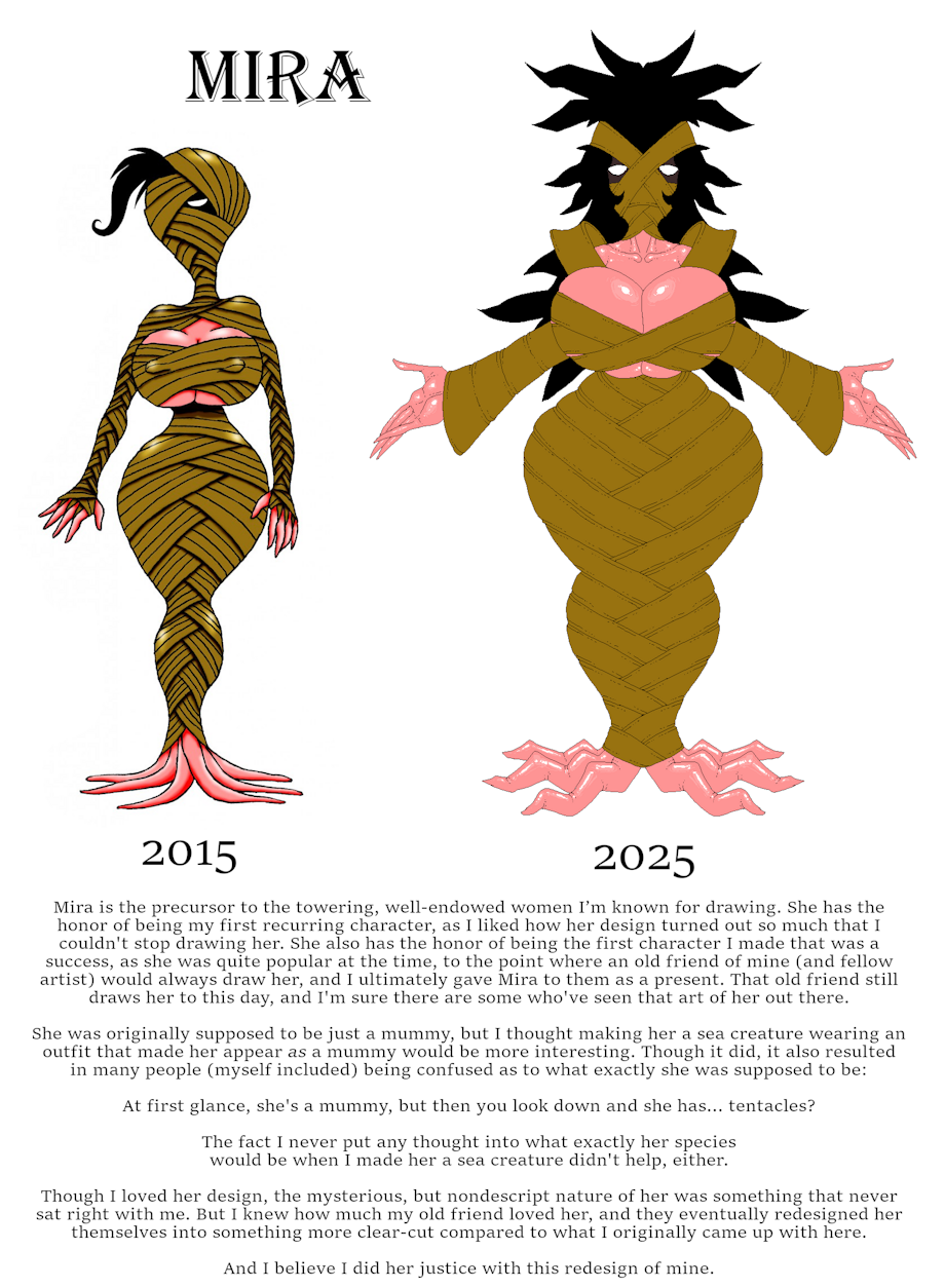 I think the process of creating her is what makes it so interesting. To put 2 separate ideas together that never have been before it definitely creates a need to decode and understand what this creature might be. I've never seen a character design like this. I really appreciate her new design, it has so many nice shapes that emulate her tentacle like quality. The pose of her hands also tell much more about her status and purpose. Very cool to see redesign after 10 years!