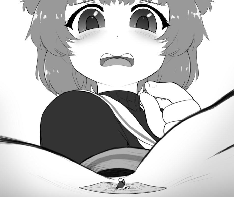 CUTE, what a teeny tiny little Tomoyo! Fantastic depiction of a fun idea! Sakura's face as she looks down at her palm, awwww. I really like how she has The Big card pinched between her fingers both to imply its usage as well as provide further contextual scale for how small Tomoyo is compared to her enormous hand, since it's so big that it fills the bottom of the screen. Could easily venture across her fingertips like this! What a fun scale, good work convincing her, Tomoyo!