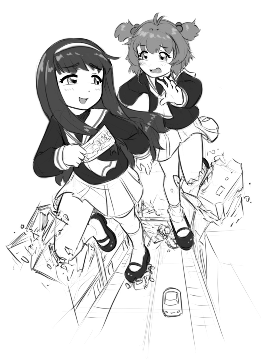 Hahahahaha, Tomoyo's face in the second one. Sakura will have to try harder than that to get The Big back! Tearing up the city in the meantime as they run on through, one of many, many awesome ideas that got sketched up tonight! I can see why you wanted to be a bit quicker on this one, so it does look a little wonky, but I like the result all the same! Still managed to get a good amount of MJcrunch and wreckage in there!
