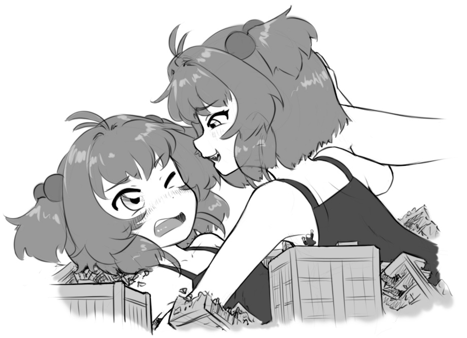 Tomoyo cheering Sakura's double on as she films the whole thing, hahahahahaha. Amazing. What an aggressive doppelganger! Adorable Sakuraface, her hoeeees will echo for miles! Whole lot of destruction going on around the two of them, only natural given how big they are! Clever way to quickly depict a complex pose interaction setup like this too. Sakura's leg placement, dangerous! Only thing I'd say is that the double Sakura's mouth curve is a little too extreme still.