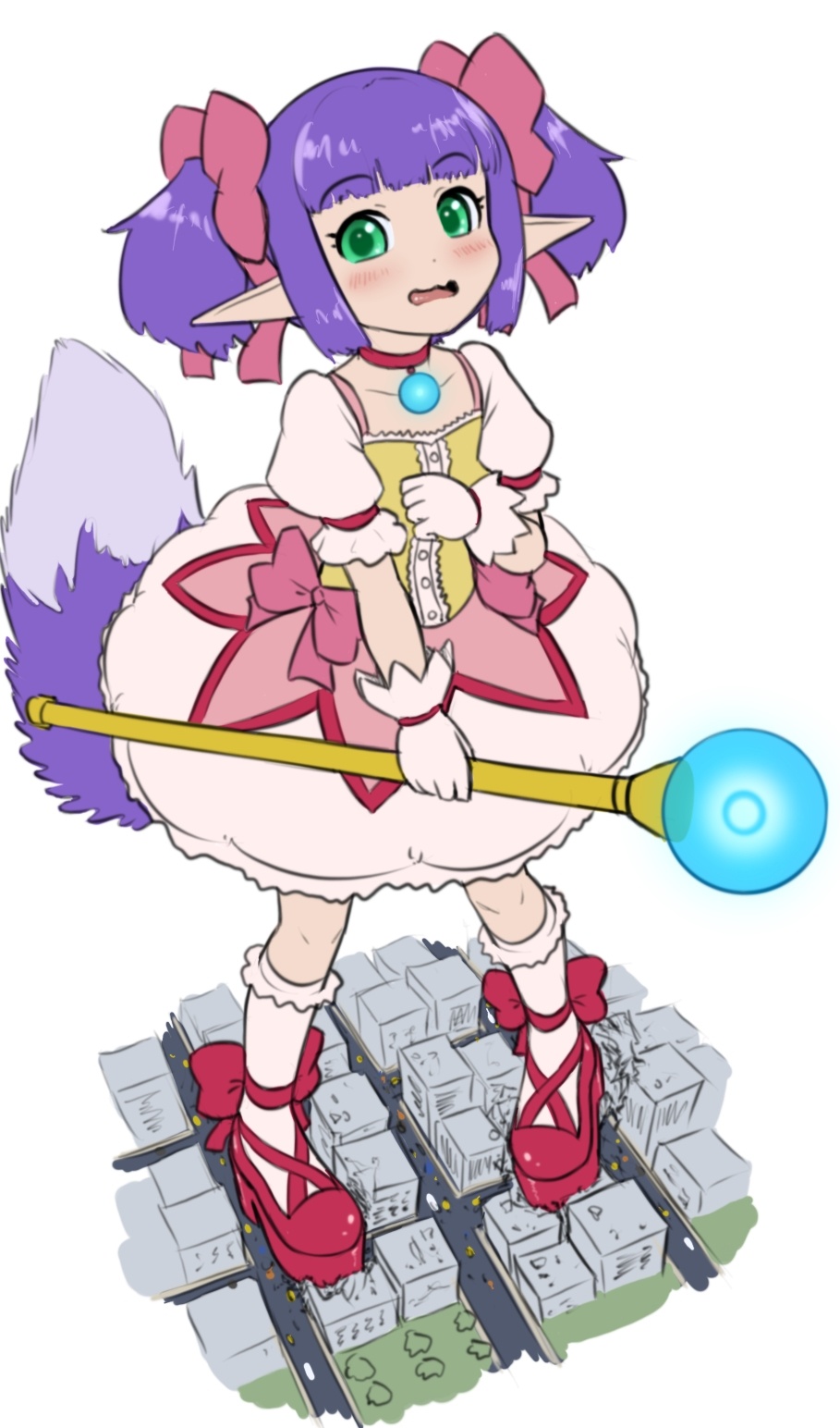 Awwww, Flix looks precious in Madoka's mahou outfit! Glad this is in color, the palette is adorably pleasing to look at, especially with the pastel depiction. Her nervous body language too, awwww. A prime scale for her to be as well, her Madokashoes easily tower over even the tallest buildings around! Plenty of crunch to be had as they occupy whole streets, going beyond even the level of a shoe tight fit! The specklike cars dotting the way are always a welcome touch there too, making her feel all the bigger. Madoka's poofy skirt and Flix's fluffy tail look great from above!