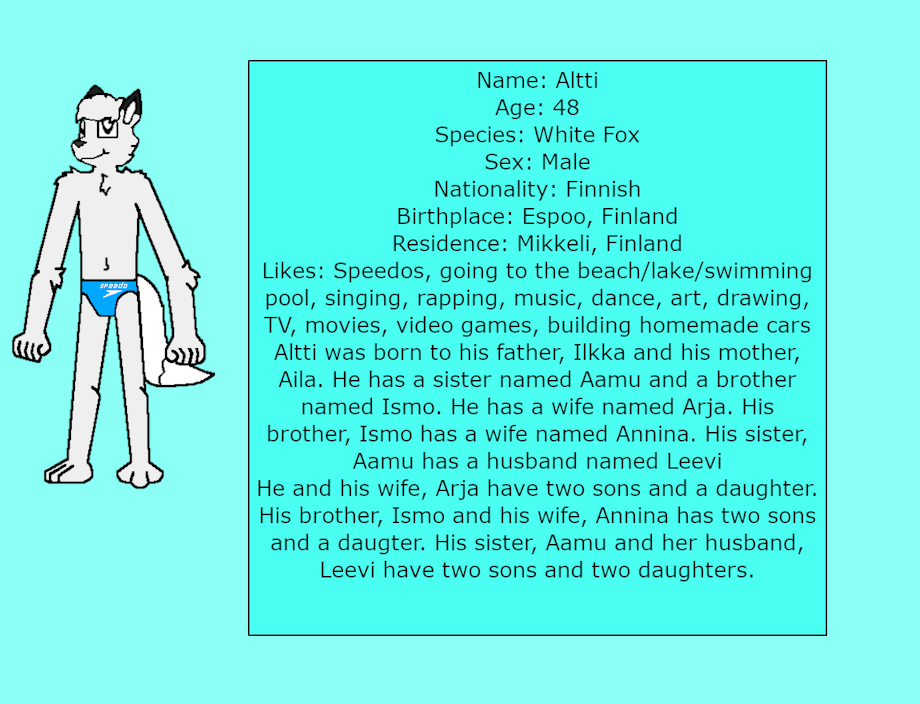 Name: Altti Age: 48 Species: White Fox Sex: Male Nationality: Finnish Birthplace: Espoo, Finland Residence: Mikkeli, Finland Likes: Speedos, going to the beach/lake/swimming pool, singing, rapping, music, dance, art, drawing, TV, movies, video games, building homemade cars He was born to his father, Ilkka and his mother, Aila. He has a sister named Aamu and a brother named Ismo. He has a wife named Arja. He and Arja have two sons and a daughter. His brother, Ismo has a wife named Annina. Ismo and Annina have two sons and a daughter. His sister, Aamu has a husband named Leevi. Aamu and Leevi have two sons and two daughters.