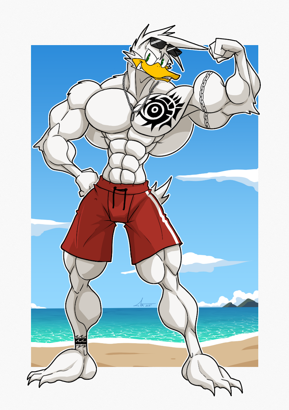 Note: he's based upon Donald Duck and especially on AI generated images I did numerous times to buff him up. After months of fun, I started building a backstory about this duck, gave him some tattoos, a slightly different look and finally made him my own character.