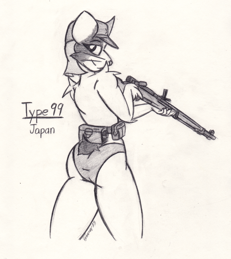 For Japan, we have our Japanese bobtail cat with a fine early-war specimen of the Type 99, complete with anti-aircraft sights, monopod, and dust cover.