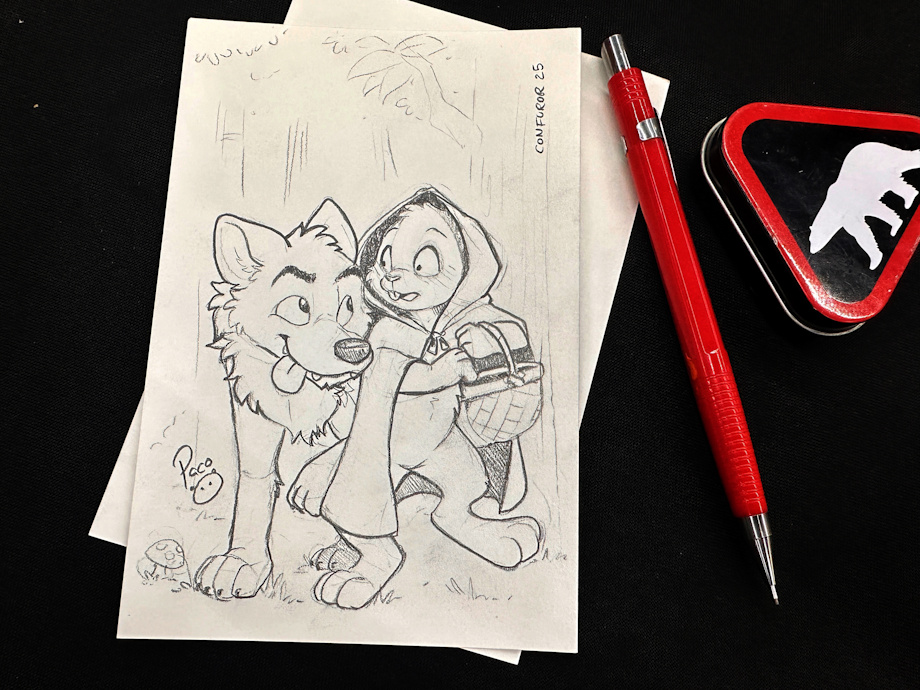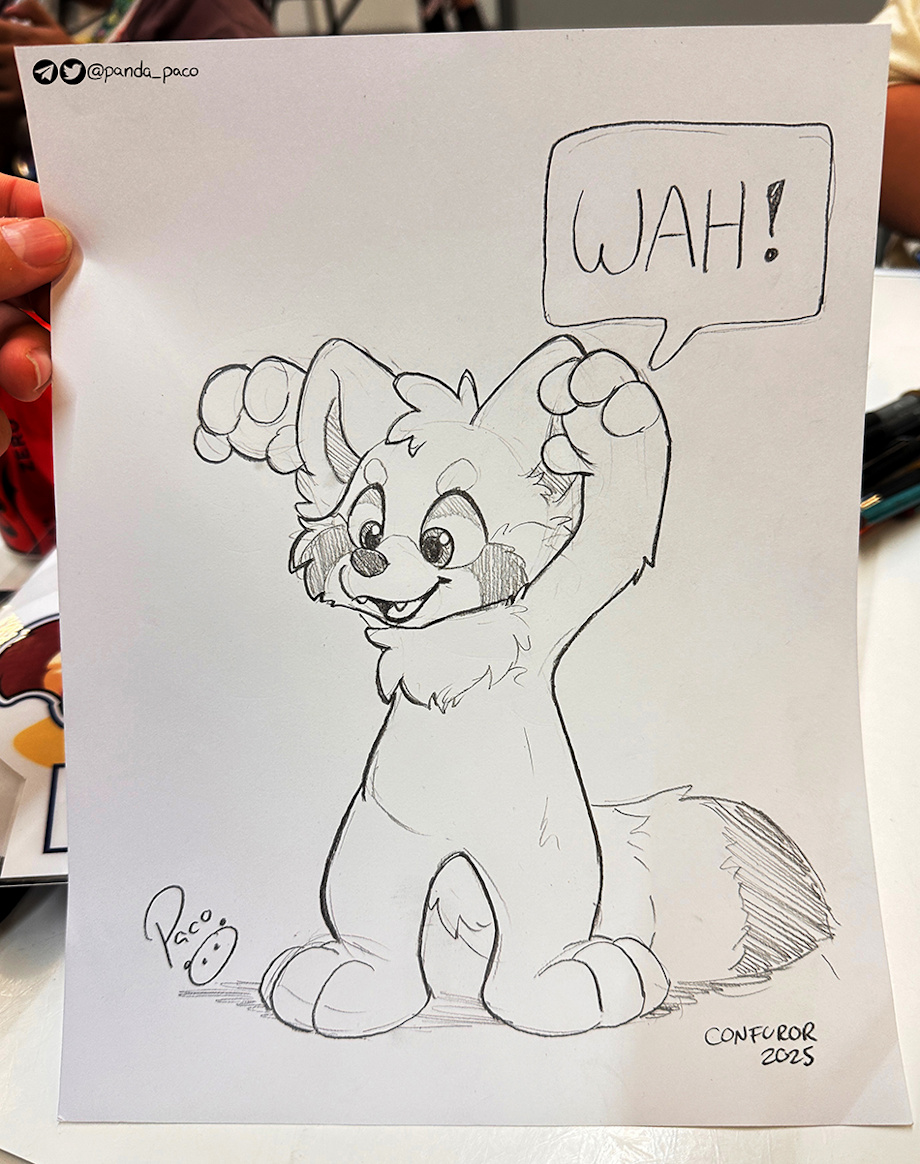 He’s Rauch the wah! I had the pleasure of meeting him and doing an art trade during a late-night art jam. This little red panda can jump! He almost reached the edge of the sketchbook! Traditional piece, drawn with pencils, for Panda Rauch.
