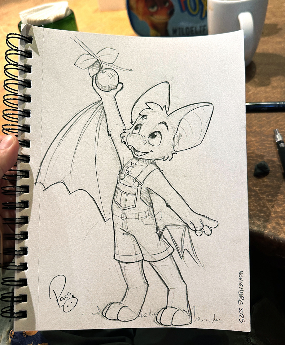 Nigel could totally fly to grab that apple… but... stretch first, wings later! A quick sketch for