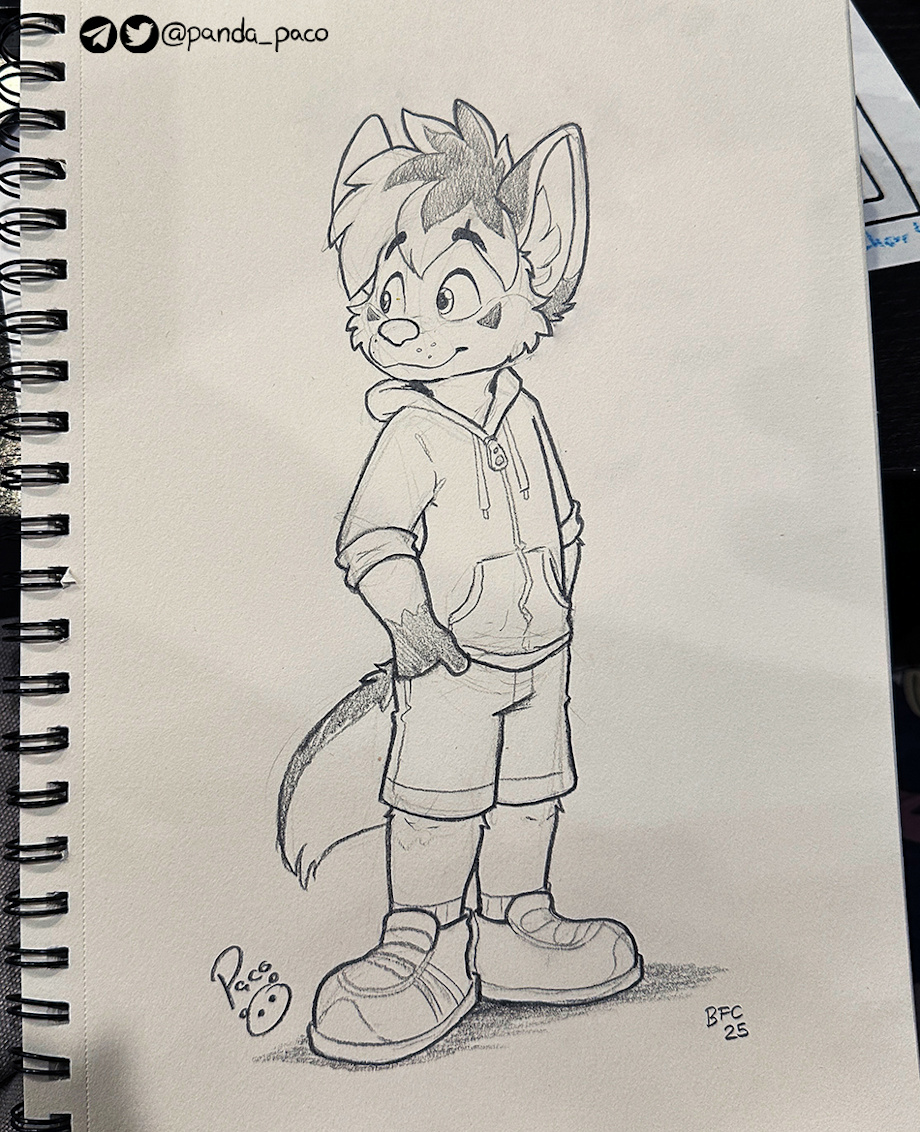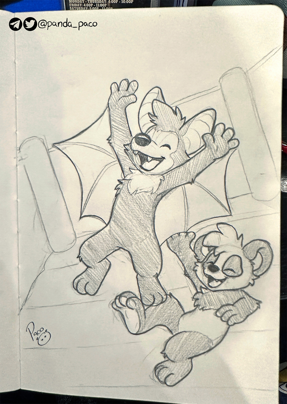 He’s Rauch the wah! I had the pleasure of meeting him and doing an art trade during a late-night art jam. This little red panda can jump! He almost reached the edge of the sketchbook! Traditional piece, drawn with pencils, for Panda Rauch.