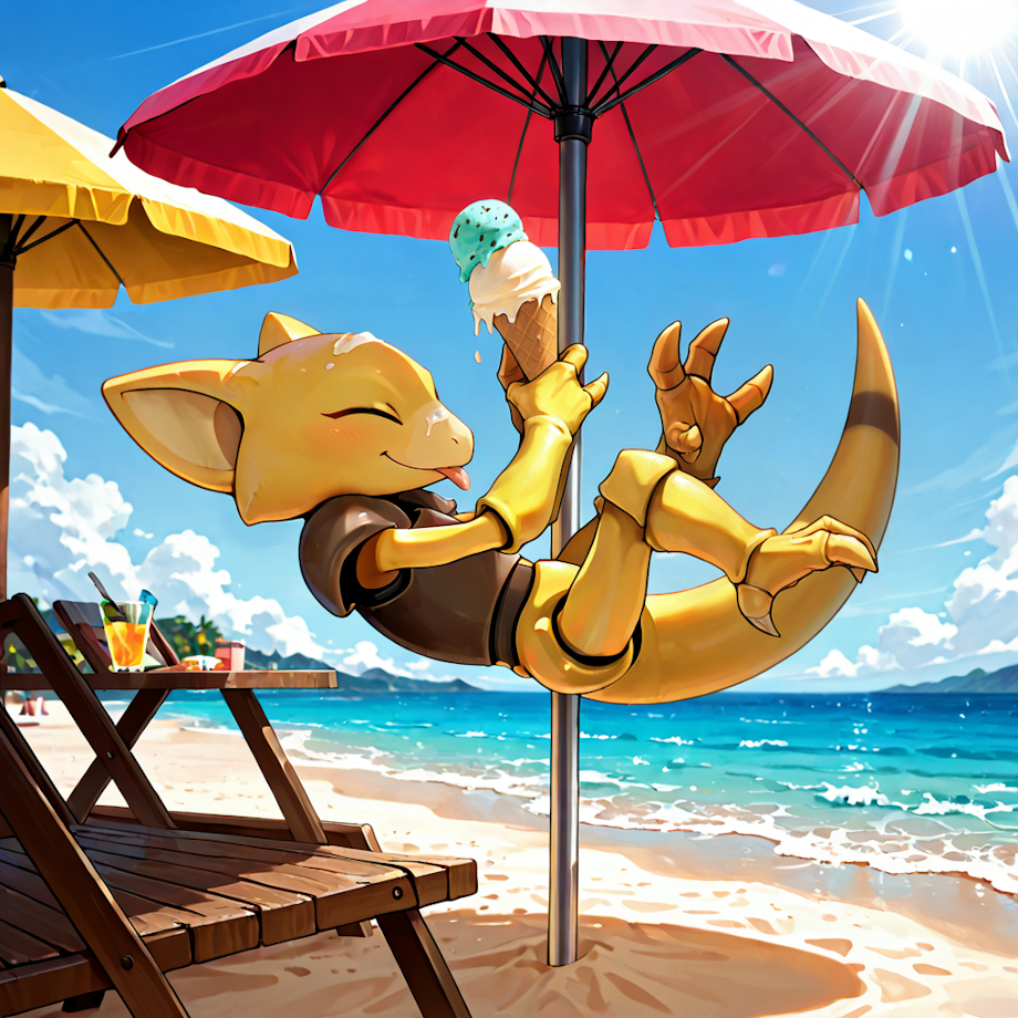 (anthro:1),(masterpiece),(best quality),(detailed face:1),detailed background, solo, <lora:AbraPokedexPDXL:1> zzabr,Abra,,floating, sunlight, beach, smile, beach umbrella, closed eyes, from side, tongue out, ice cream, licking cream, cream on face