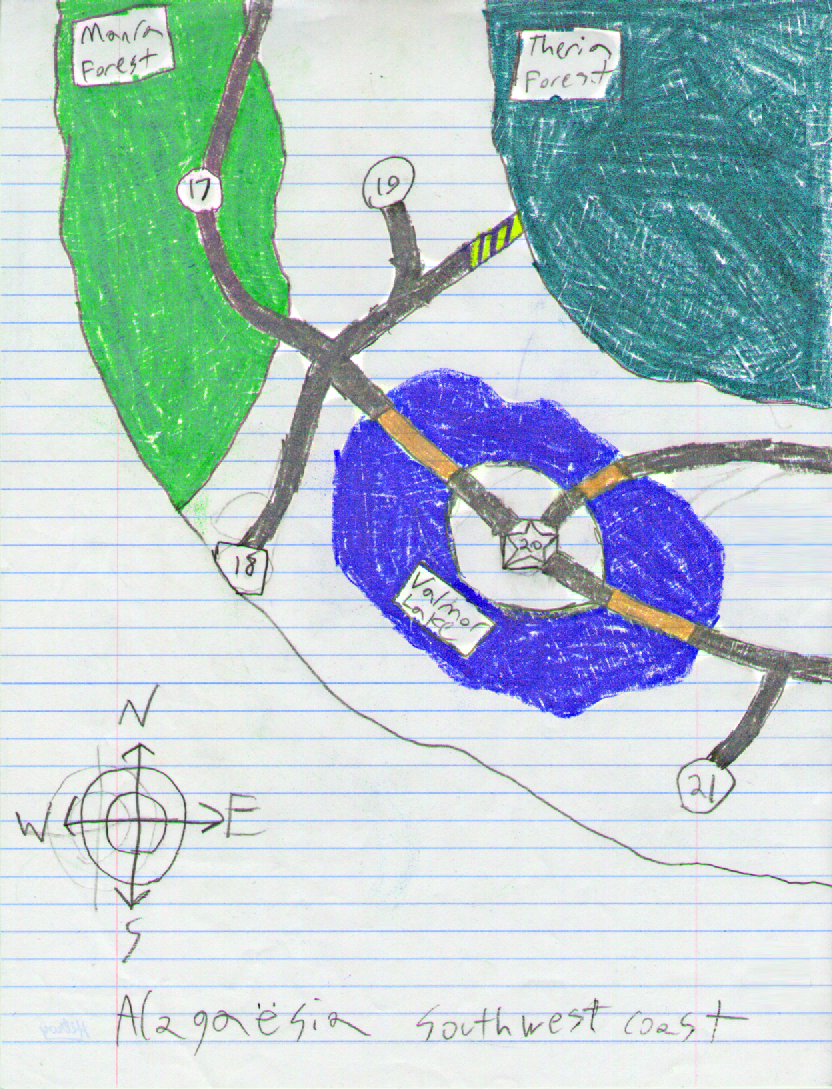 This is a map of Mage Yoshi's home island, Alagaesia. There are Six different parts to the map, four of which are a map of the island, and two are maps of coastal islets nearby.