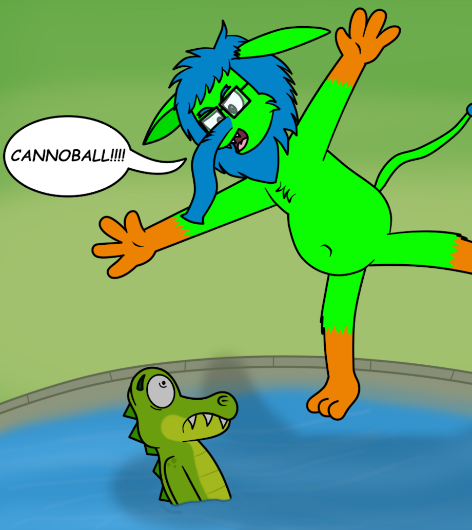 Patch leaps from a great height into the pool for a great cannonball, while Croc watches in horror as he is about to be crushed by an Elelion.