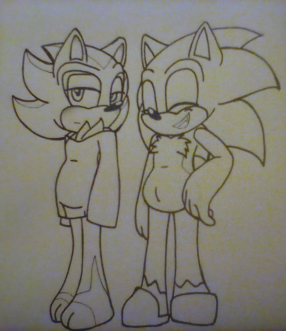 I decided to draw how differently think that Sonic and Shadow would feel about themselves during their pregnancies. Shadow would feel more vulnerable and exposed than he normally would so he starts wearing an oversized night shirt to cover up in so he feels more secure, while Sonic is as cheerful and confident as ever! He starts wearing slippers or just socks because his shoes are more uncomfortable to wear in the later stages and he stops wearing his gloves so he can feel how soft his and Shadow's fur has gotten