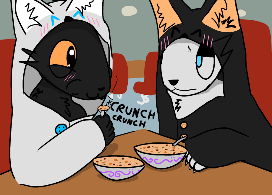 i did a thing, again. they eating while wearing matching kigus :D but one of em is more enthusiastic then the other, dont look too closely at stuff either like the spook or hand. inspired by LookFox's art piece that was similar