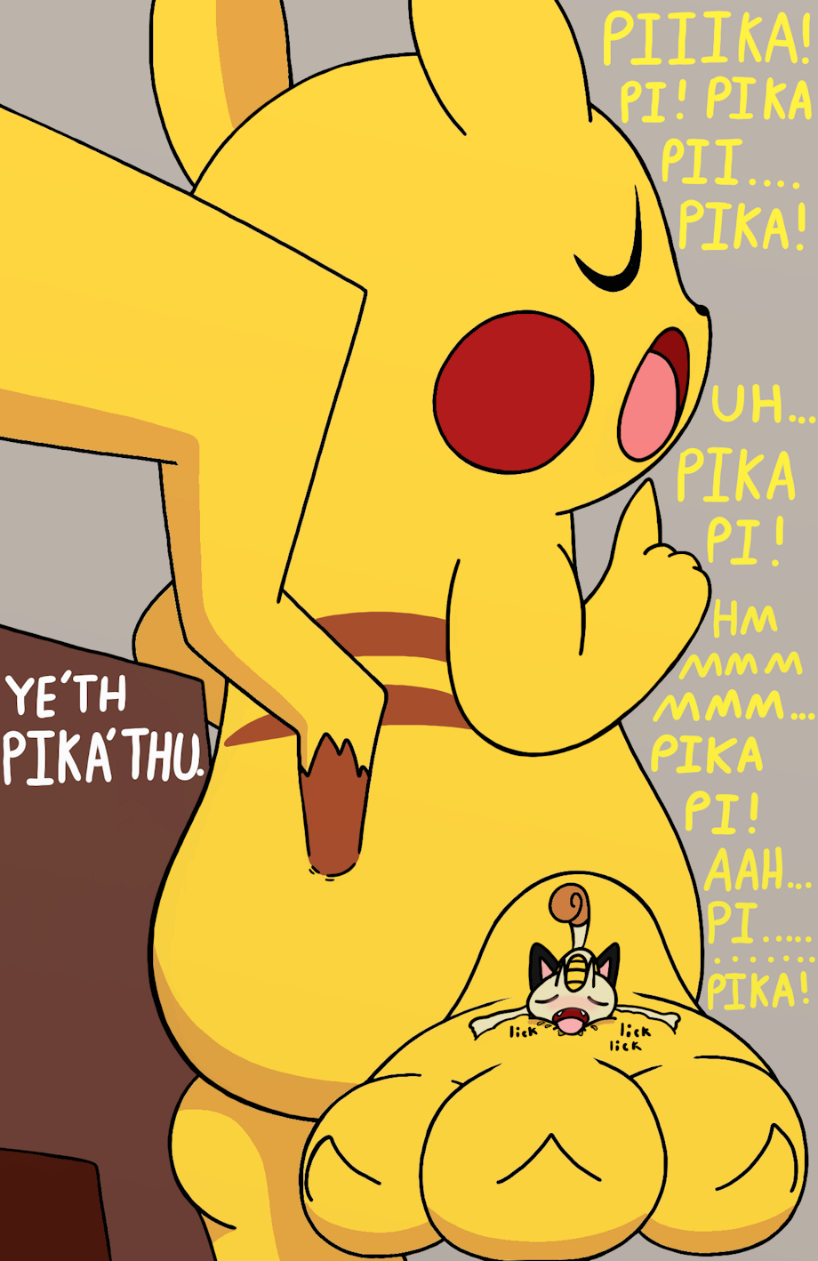 Pikachu discussed with Meowth that he'll release him if he licks and worships his paws for about half an hour. Meowth, not in the best situation currently and understanding the Pokemon language has agree to begin fondling, licking and admiring the giant Pika's feet. Meowth secretly became a paw lover towards Pikachu's feet that day. The shrink effect eventually wore off and Meowth embarrassingly had to return to Jessie and James empty-handed without a captured Pikachu while Pikachu happily returned to Ash after having Meowth fondle his paws.