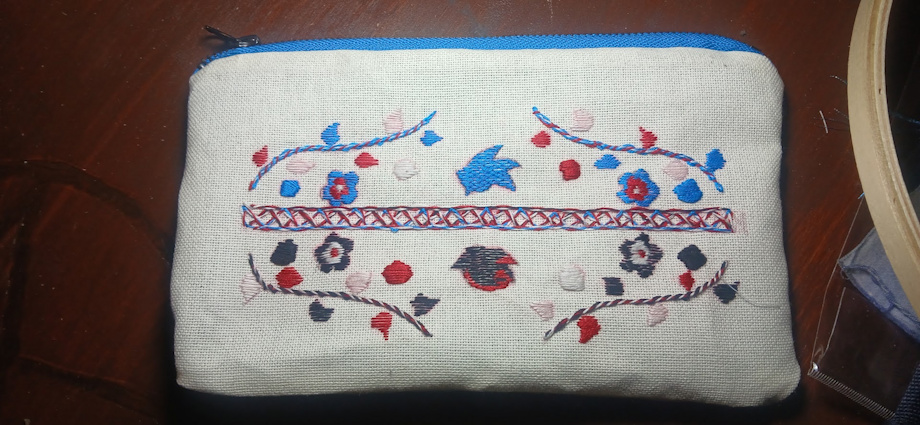 Construction: Every stitch was done by hand, and the pouch itself was sewn and finished with a blue zipper to match.