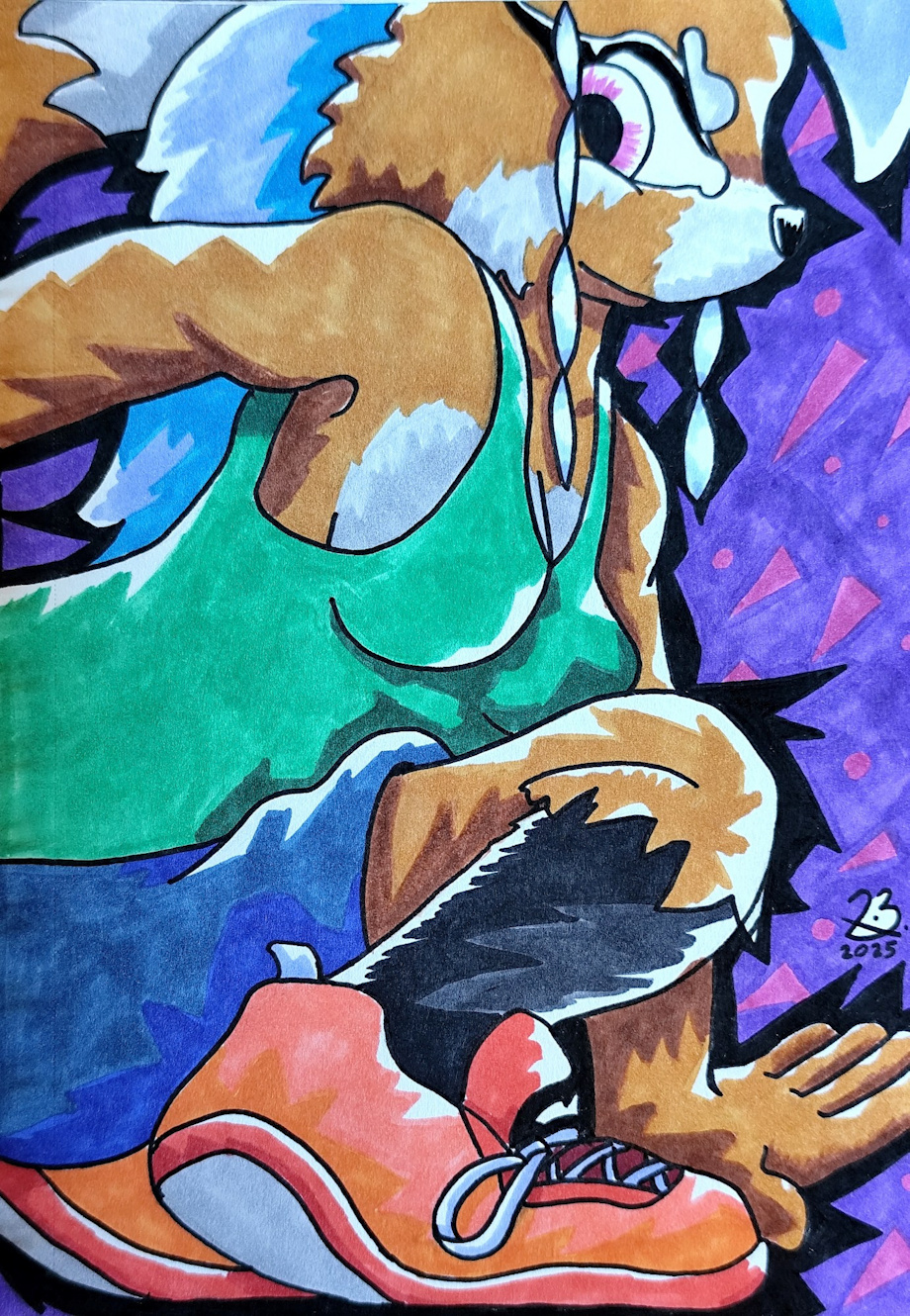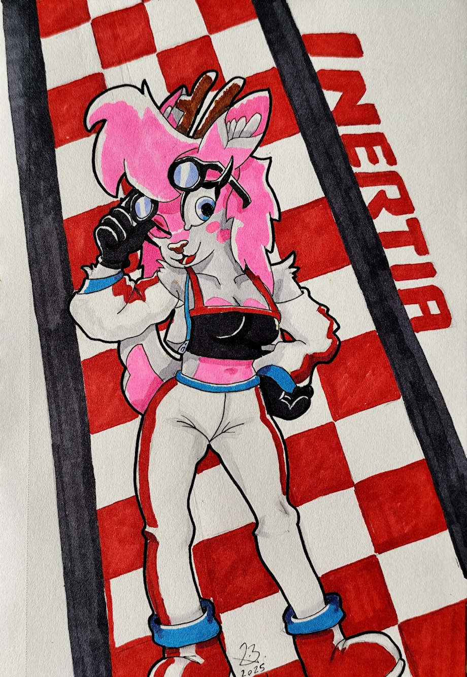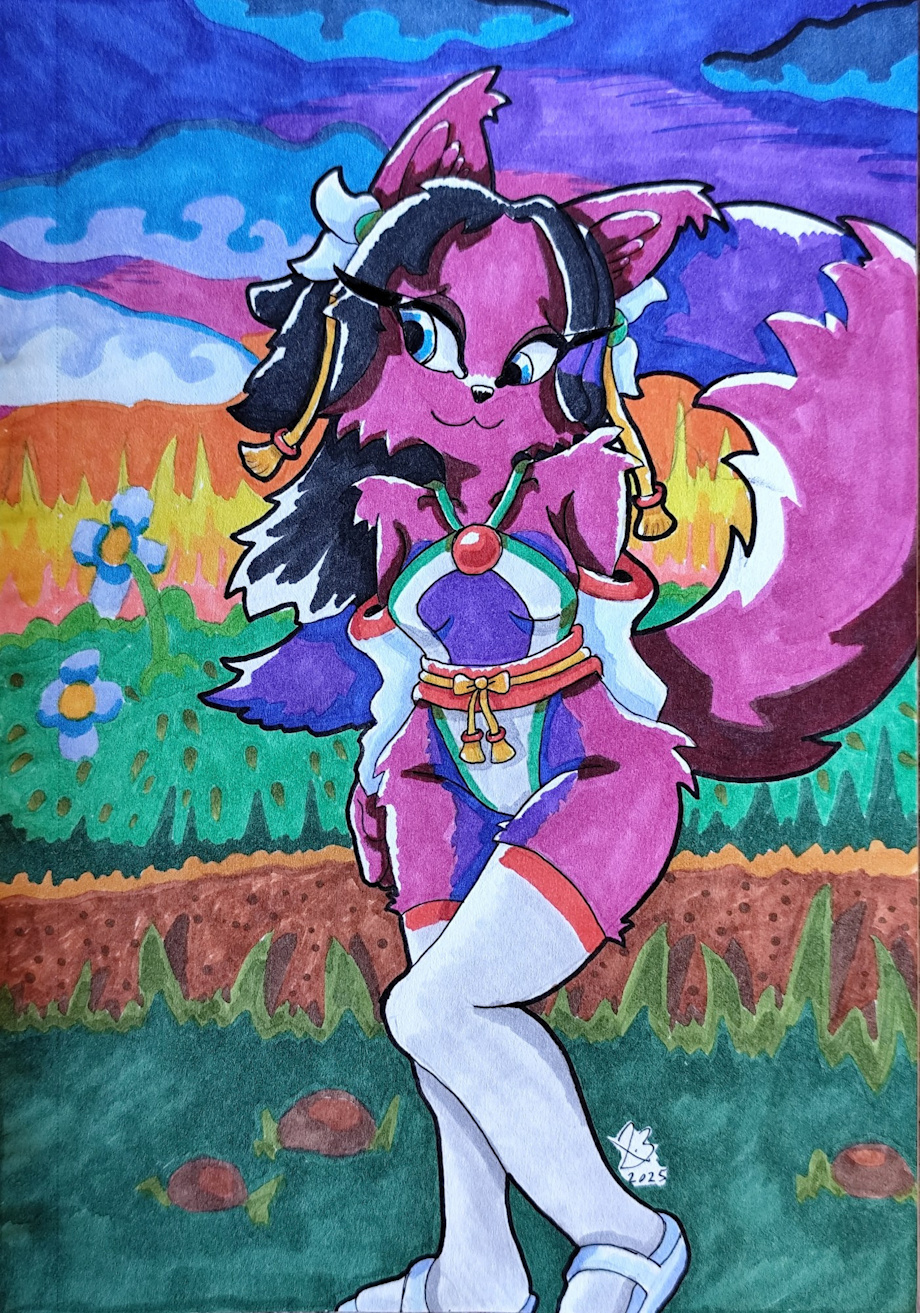 Leenah the Magenta colored anthro cat is standing in a grassy field at twilight. Her counter fur is purple and is visible on the end of her tail, as well as her breasts, stomach and thighs. Her eyes are bright blue, and she has long black hair. She's wearing bow earrings with tassels that hang down from them, and a white and green split full body suit with a tassel belt along her waist. She also has orange and white leggings and arm cuffs. On her feet are bright blue slippers. Behind her is a dirt path, flowers, yellow grass and a cloudy sky full of purples and dark blues.