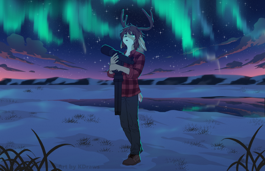 A calm winter night under the northern lights. Shaun's taking a quiet moment to watch the aurora and soak in the view. This was a really fun piece to work on, thank you so much for commissioning me.
