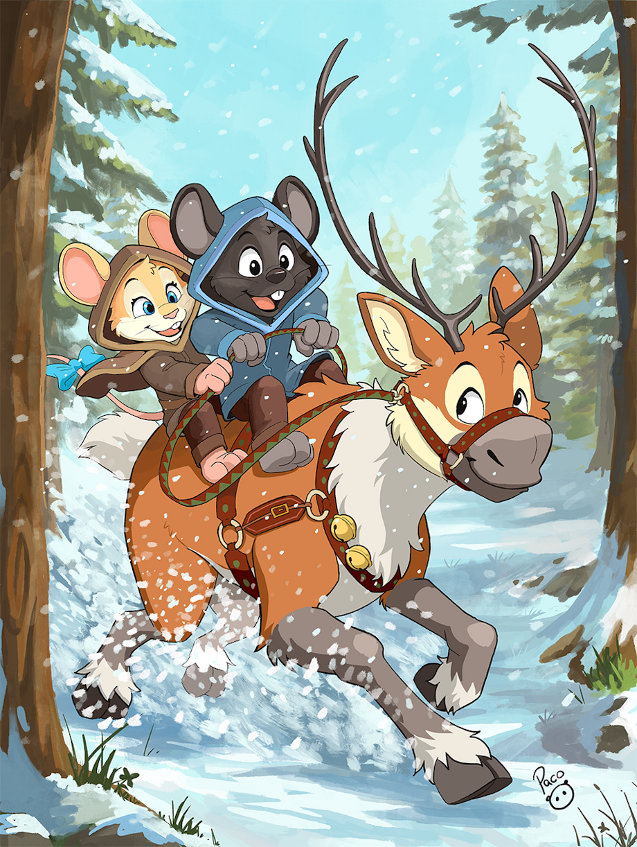 Painting for NordicFuzzCon, featuring my dear Mausie and Iris, two characters that, if you have seen my art for long ago, I enjoy a really lot drawing and painting. Also featuring Svæn, definitely not-Sven, it is Sven's cousin.
