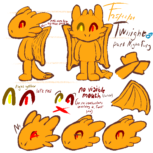 Orange scales, left red eye, right yellow eye. No visible mouth (i dont want to that's why)