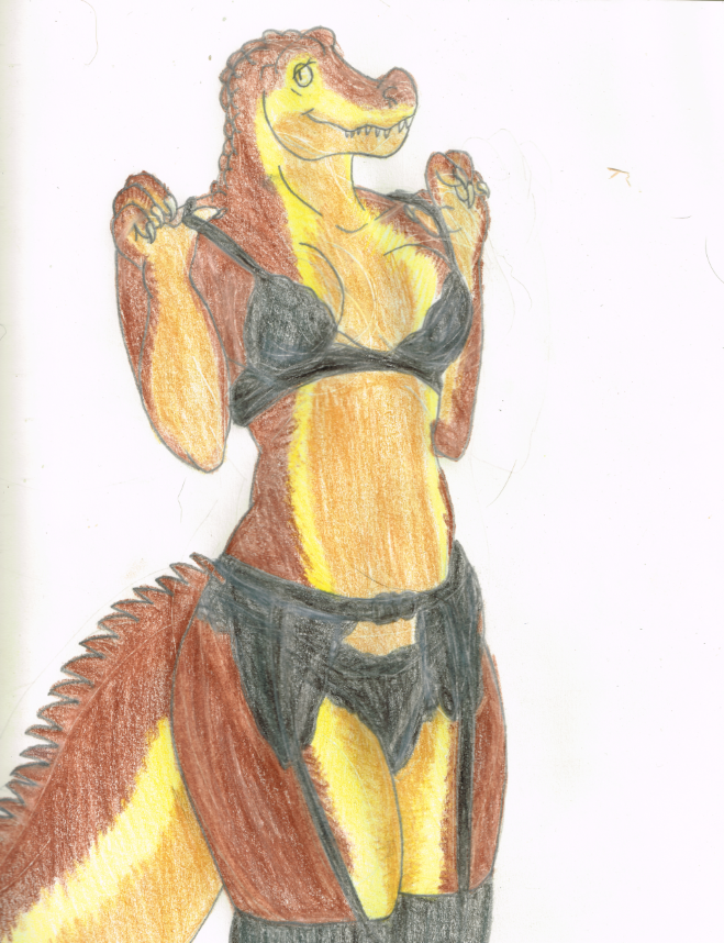 This was another drawing that took me way too long to actually finish, it's my Chinese Alligator char Penny posing in lingerie, admittedly based off of pinup art of the vampire girl in Hotel Transylvania.