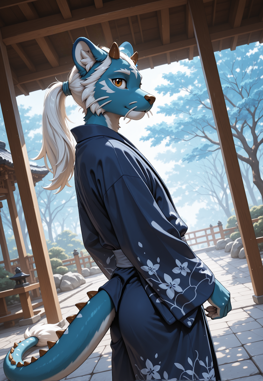 1boy, animal ears, animal nose, anthro, blue and white fur, brown horns, brown nose, dragon, male furry, solo, whiskers, white hair, long hair, yukata, open eyes, looking at viewer, masterpiece, best quality, very aesthetic, 4k, digital media (artwork), detailed background, dynamic pose, tiger dragon hybrid, countershade skin, countershade fur, dynamic lighting, Cherryblossom tree, Japanese Garden, Japanese, realistic, (Realism:1.3), cowboy shot, spikes down tail, ponytail