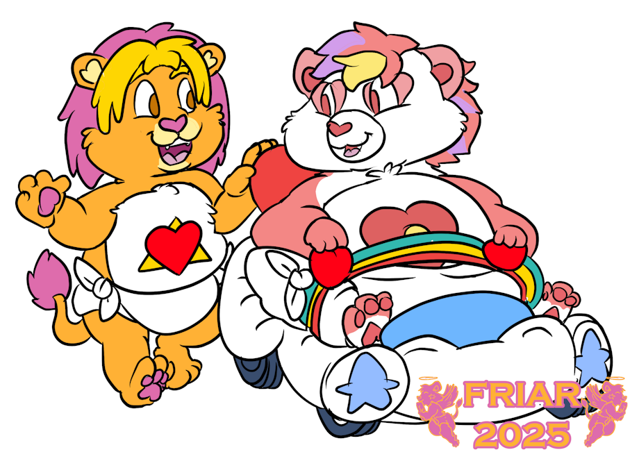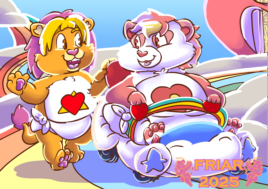Illustrated commission of Light Heart Lion the diapered care bear cousin lion with the heart and light triangle tummy symbol walking Token Heart Bear around in a cloud car mobility scooter around Care A Lot.