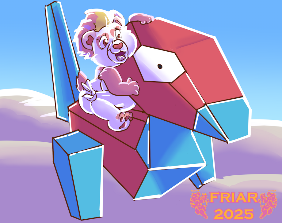 Illustrated commission of Token Heart Bear flying on the back of a large Porgyon in the skies.