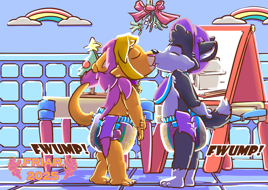 Illustrated flat commission of Summer Laverdure the diapered papillon pup seated and cutely waving.