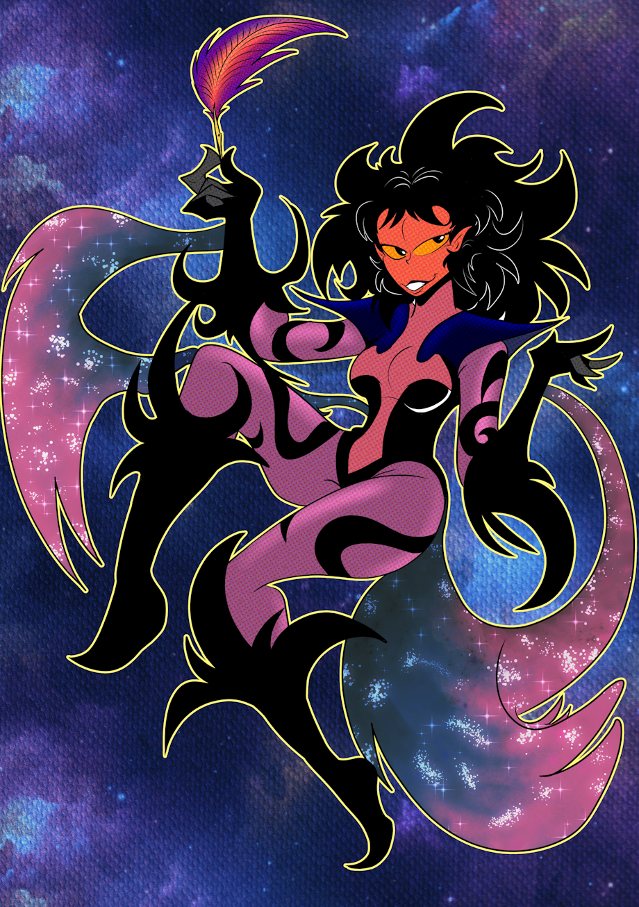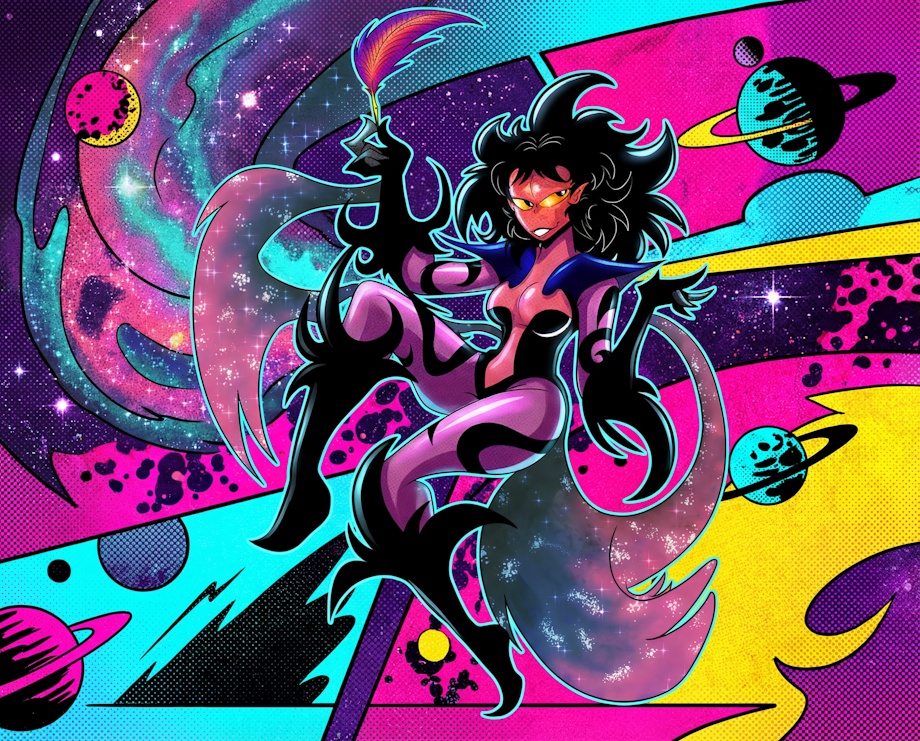 Deluz being The Goddess and Cosmic Architect of The RBComics Universe, what you see is what you get. This queer, cosmic "costume" she wears is her body, her flesh; she's quite nude.