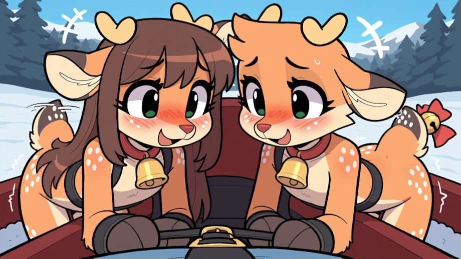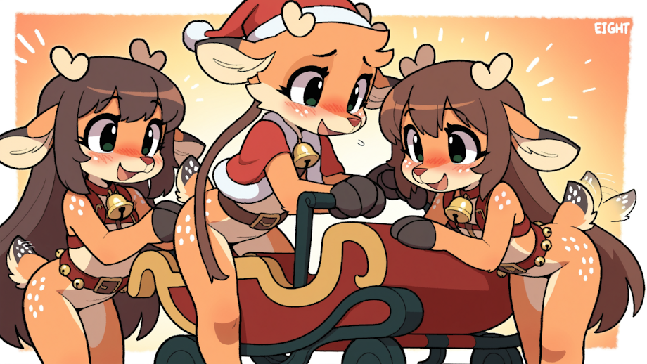 furry, anthropomorphic, most beautiful girls, eight deer girls, toddlers, young, lined up in 2 rows in front of sleigh, reigns connecting girls to sleigh, view from sleigh, pulling Santa's sleigh, leaning forward, wearing harnesses, laughing, happy, anthro, furry, deer, neck bell, tail bell,orange fur,very long hair, brown hair, red nose, belt harness, wearing harnesses, bells on tails and harnesses, furry, wagging tail, raised tail, deer tail,Furry,animal ears,green eyes,body fur,deer ears,small deer horns,orange fur, leaking,