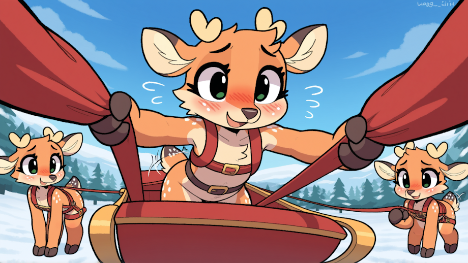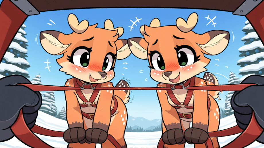 furry, anthropomorphic, most beautiful girls, eight deer girls, toddlers, young, lined up in 2 rows in front of sleigh, reigns connecting girls to sleigh, view from sleigh, pulling Santa's sleigh, leaning forward, wearing harnesses, laughing, happy, anthro, furry, deer, neck bell, tail bell,orange fur,very long hair, brown hair, red nose, belt harness, wearing harnesses, bells on tails and harnesses, furry, wagging tail, raised tail, deer tail,Furry,animal ears,green eyes,body fur,deer ears,small deer horns,orange fur, leaking,