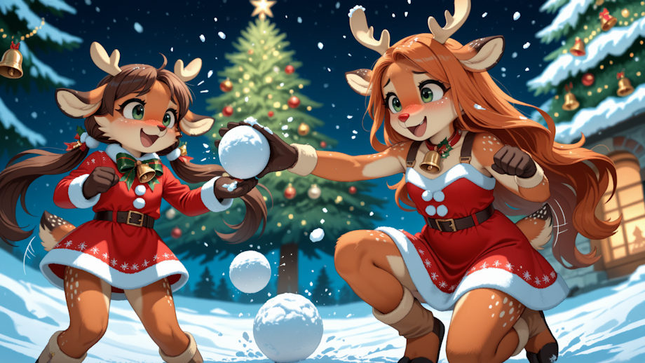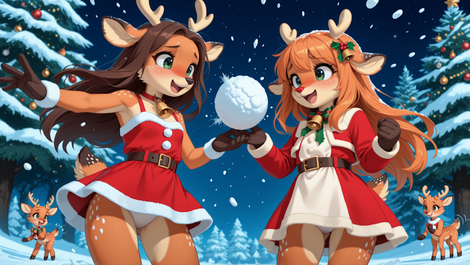 furry, anthropomorphic, most beautiful young girls, toddlers, deer girls, snowball fight, cute christmas dresses, short dresses, white panties, throwing snow balls at each other, laughing, happy, anthro, furry, deer, from below,neck bell, tail bell,orange fur,very long hair,frustrated,brown hair, red nose, belt harness, wearing harnesses, bells on tails and harnesses, furry, wagging tail, raised tail, deer tail,Furry,animal ears,green eyes,body fur,deer ears,small deer horns,orange fur, spread