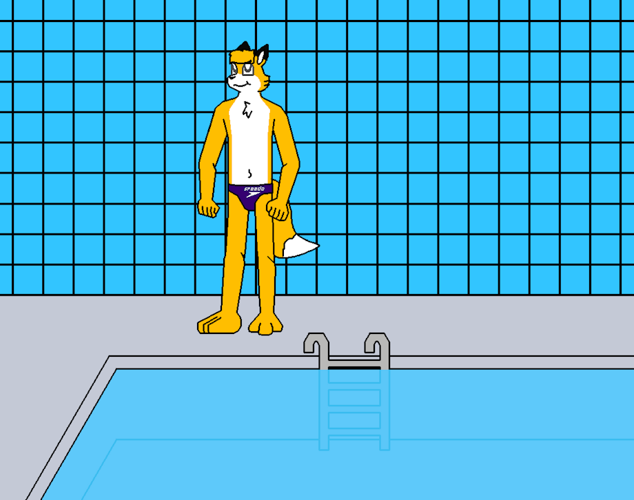 Émilien the Orange/White Fox (42 years old) is in his own indoor swimming pool while dressed in only his purple speedo.