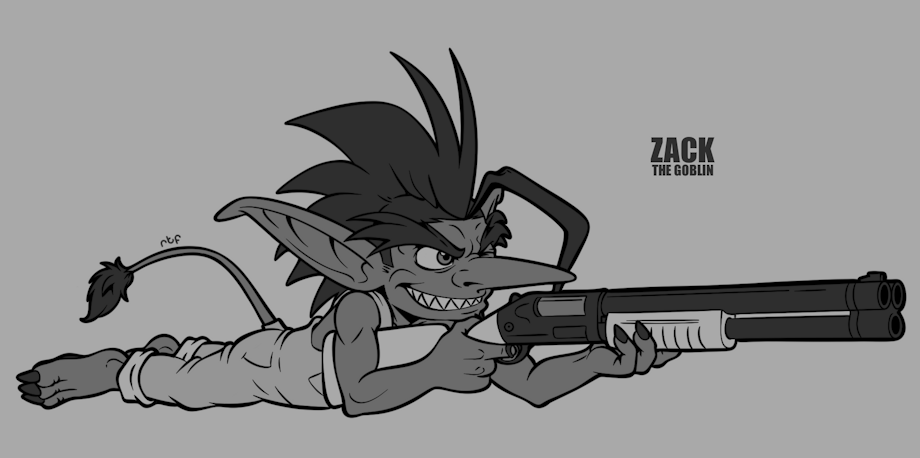 Zack is a green-skinned goblin with red eyes and broad, long-tipped ears covered in peach fuzz.