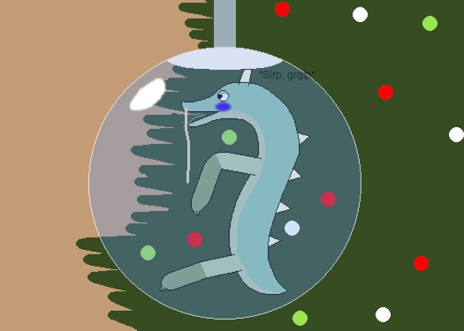 Cirrus got into a bit of a weird mood, and wanted to try something new. After telling his plan to a friend that was going to be having a Christmas party, they managed to get a hollow ornament big enough for the dragon to fit in at his smallest size. With him in there, it was hung up on the tree, as he became a sort of living ornament for the party!