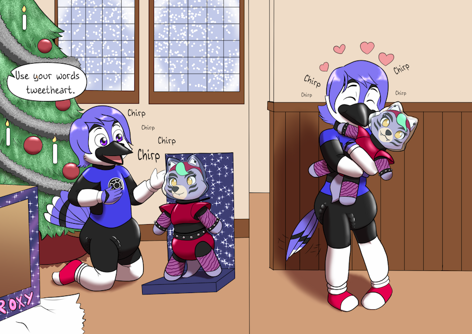 Adorable Christmas-seasonal commission from MaxiCoon featuring the resident space-cadet bluejay.