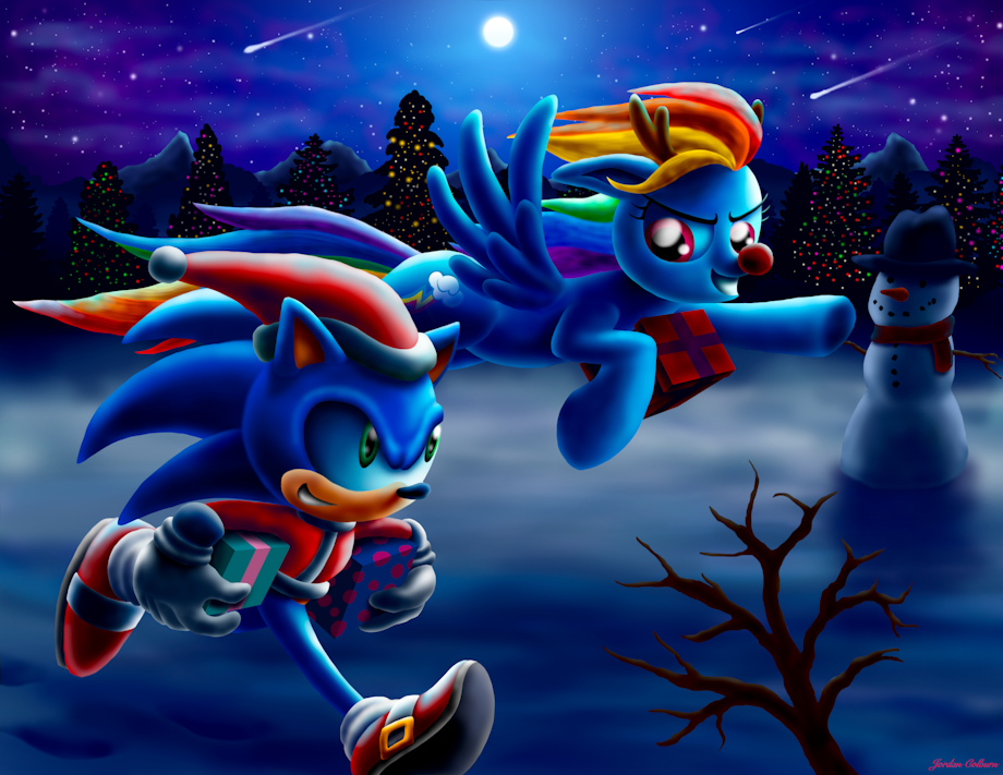 Well, this drawing concludes my 2025 projects. Partially inspired by AnimatedJames' "A Way Past 20% Cooler Christmas", https://www.youtube.com/watch?v=jF-fiv4q1Go Sonic the Hedgehog and Rainbow Dash are dressed as Santa and Rudolph while delivering Christmas presents. Hopefully they can deliver all of the presents before Christmas morning. Merry Christmas/Happy Hearth's Warming to all of my followers!